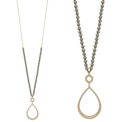 30-32in GRAY WOOD BEAD NECKLACE WITH TEXTURED TEAR DROP PENDANT
