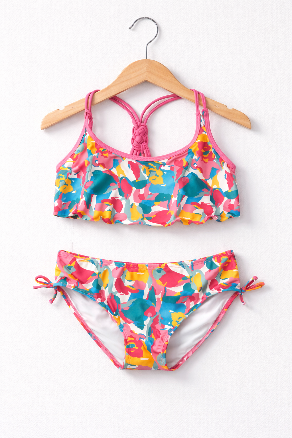 Make a splash in style! This youth girls two-piece swimsuit features vibrant, eye-catching colors designed for fun days in the sun. The top is finished with sweet scalloped edging for a playful, feminine touch, while the bottoms include an adorable side bow detail that adds extra charm.