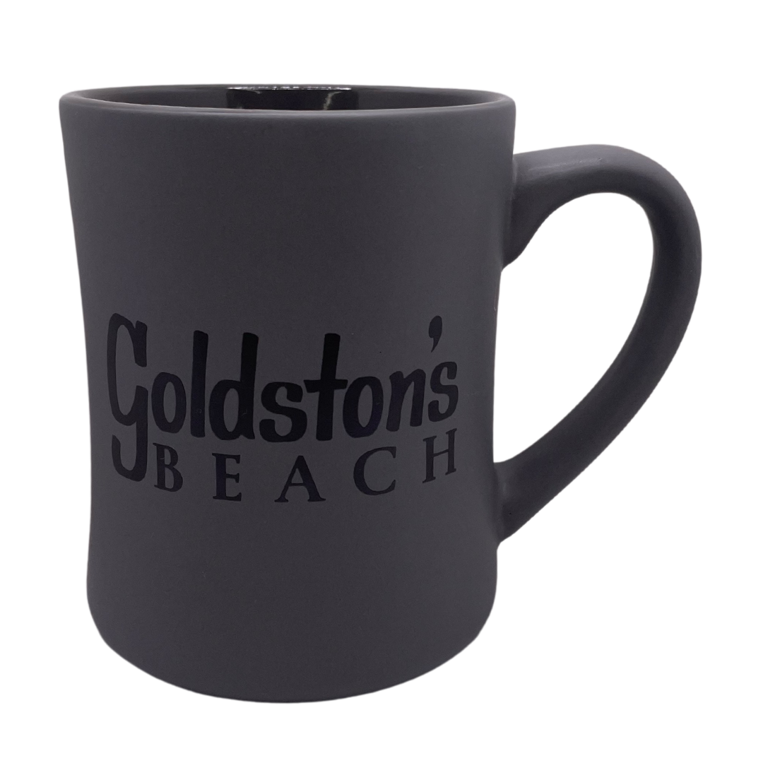 Grey "Goldston's Beach" coffee mug with black imprint.