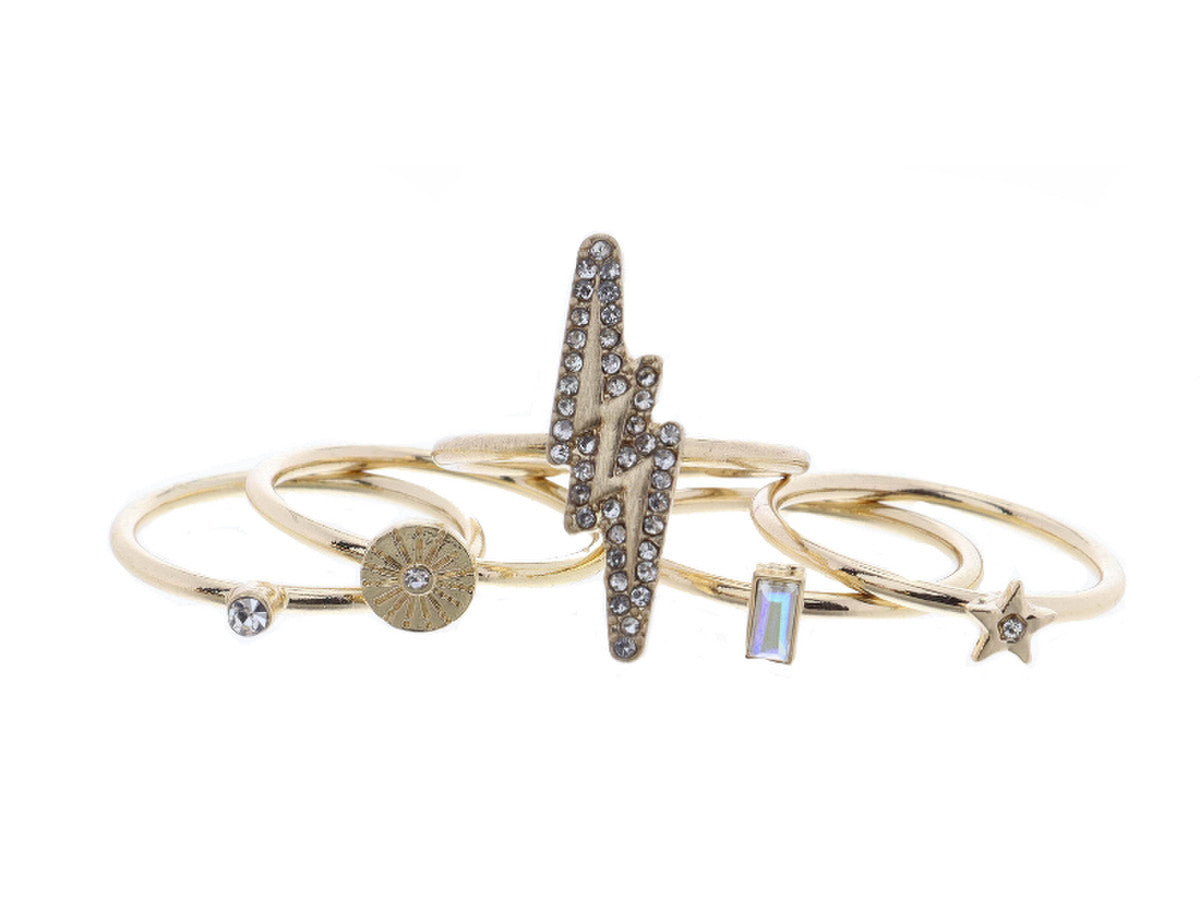 JM Set of 5 Crystal Lightning Bolt Coordinating Gold Rings