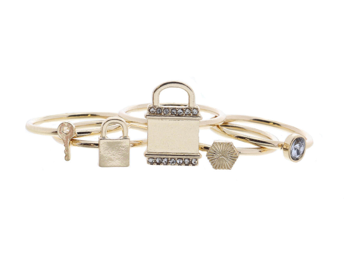 JM Set of 5 Gold Rings - Padlock with Crystals
