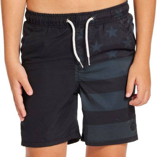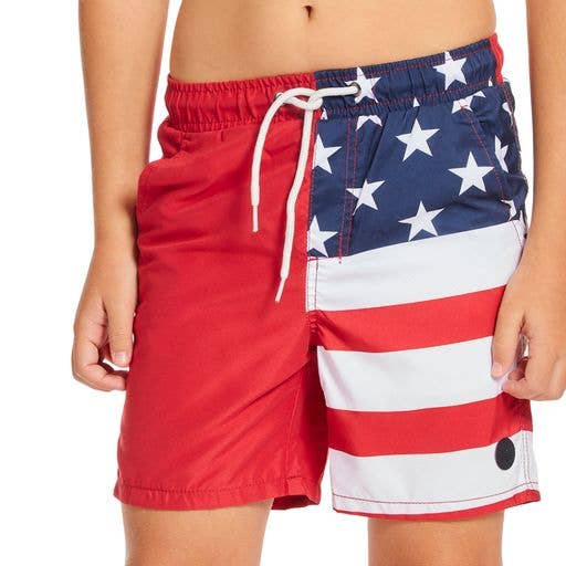 100% polyester. Boy’s American flag elastic waist swim shorts with pockets. Interior mesh lining. Standard fit.