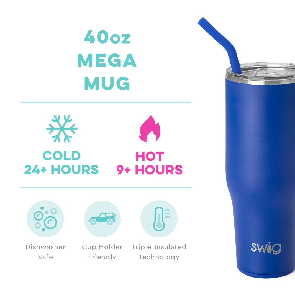 Hydrating has never been easier with our 40oz Mega Mug! The cup holder friendly frame, comfort-grip handle and flexi-tip straw with a standard plastic straw base come together to create your new favorite Swig!